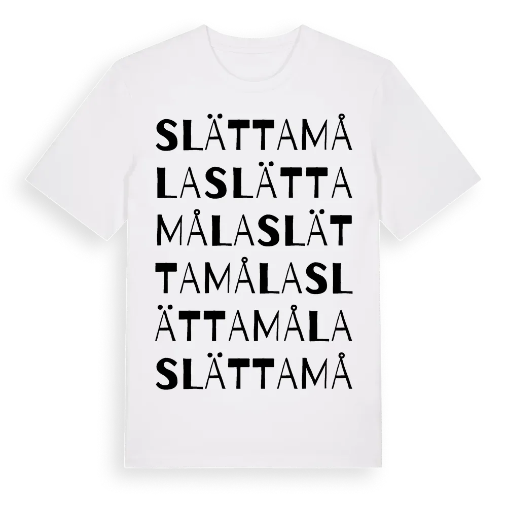 Slättamåla ordlek t-shirt är inspirerad av byn Slättamåla i Kronobergs län, Sverige. Tröjan är designad för dig som har en speciell koppling till platsen – oavsett om du bor här, har rötterna här eller bara älskar Slättamåla.