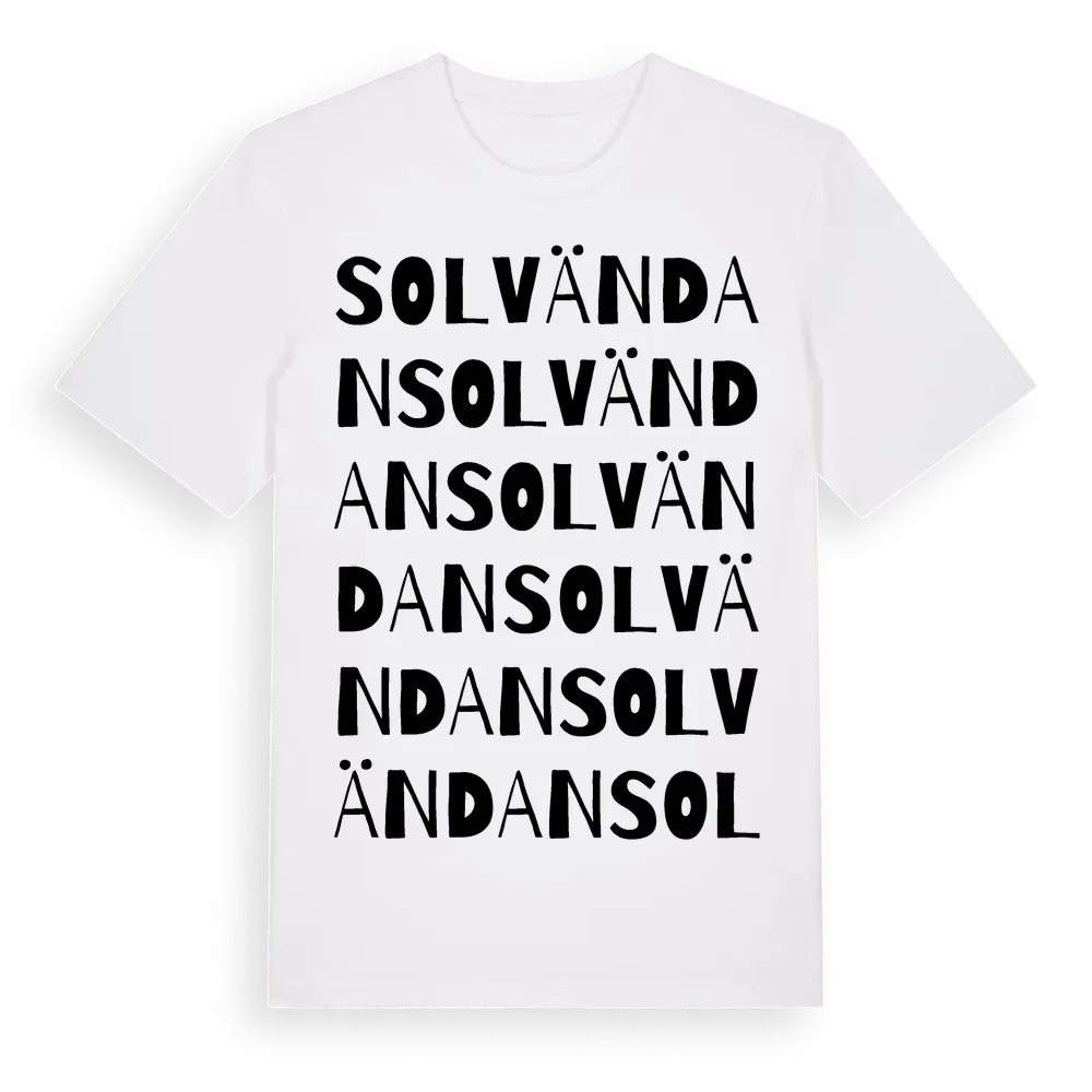 Solvändan ordlek t-shirt är inspirerad av Solvändan i Kronobergs län, Sverige. Tröjan är designad för dig som har en speciell koppling till platsen – oavsett om du bor här, har rötterna här eller bara älskar Solvändan.