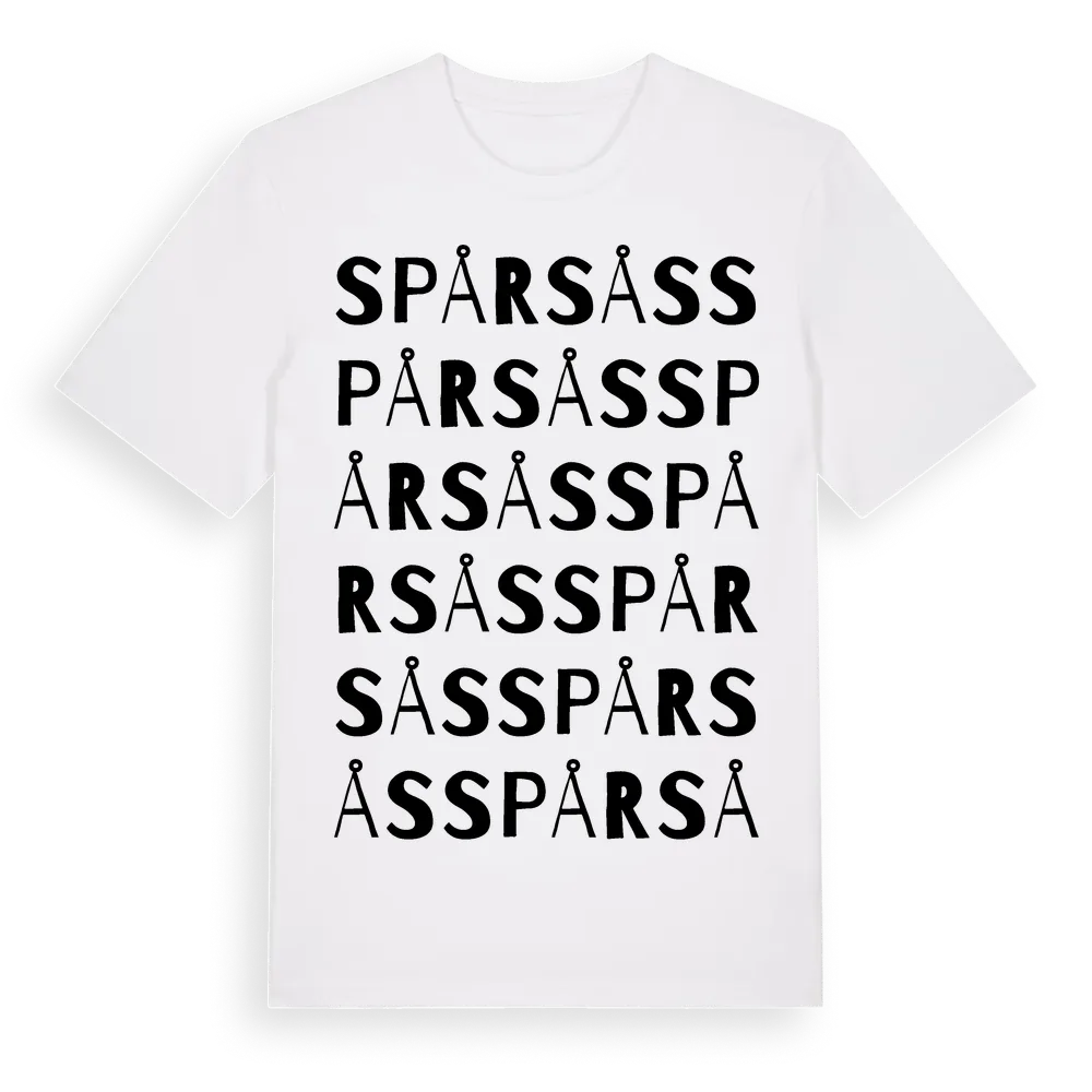 Spårsås ordlek t-shirt är inspirerad av byn Spårsås i Kronobergs län, Sverige. Tröjan är designad för dig som har en speciell koppling till platsen – oavsett om du bor här, har rötterna här eller bara älskar Spårsås.
