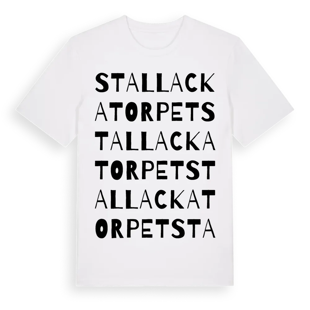 Stallackatorpet ordlek t-shirt är inspirerad av Stallackatorpet i Kronobergs län, Sverige. Tröjan är designad för dig som har en speciell koppling till platsen – oavsett om du bor här, har rötterna här eller bara älskar Stallackatorpet.