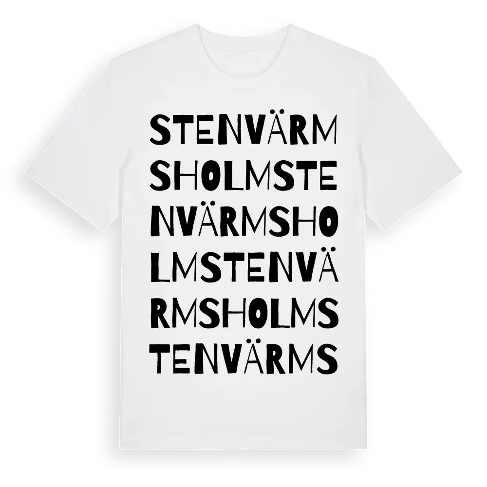 Stenvärmsholm ordlek t-shirt är inspirerad av byn Stenvärmsholm i Kronobergs län, Sverige. Tröjan är designad för dig som har en speciell koppling till platsen – oavsett om du bor här, har rötterna här eller bara älskar Stenvärmsholm.