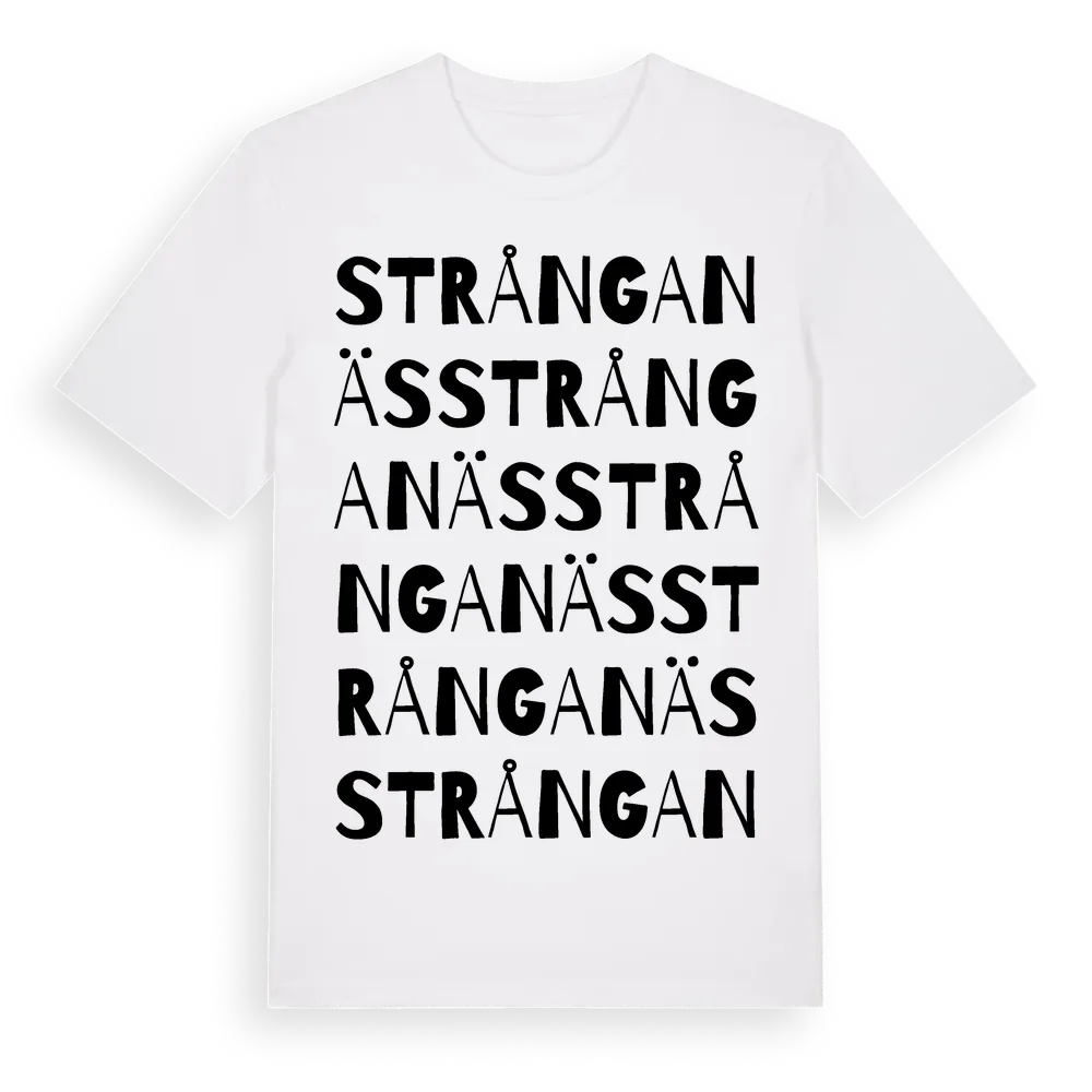 Strånganäs ordlek t-shirt är inspirerad av byn Strånganäs i Kronobergs län, Sverige. Tröjan är designad för dig som har en speciell koppling till platsen – oavsett om du bor här, har rötterna här eller bara älskar Strånganäs.