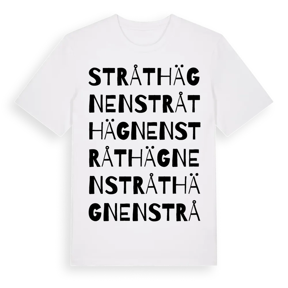 Stråthägnen ordlek t-shirt är inspirerad av Stråthägnen i Kronobergs län, Sverige. Tröjan är designad för dig som har en speciell koppling till platsen – oavsett om du bor här, har rötterna här eller bara älskar Stråthägnen.