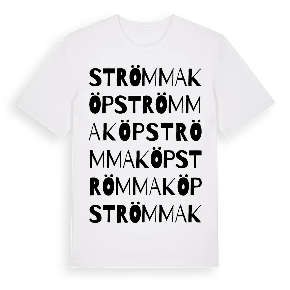 Strömmaköp ordlek t-shirt är inspirerad av byn Strömmaköp i Kronobergs län, Sverige. Tröjan är designad för dig som har en speciell koppling till platsen – oavsett om du bor här, har rötterna här eller bara älskar Strömmaköp.