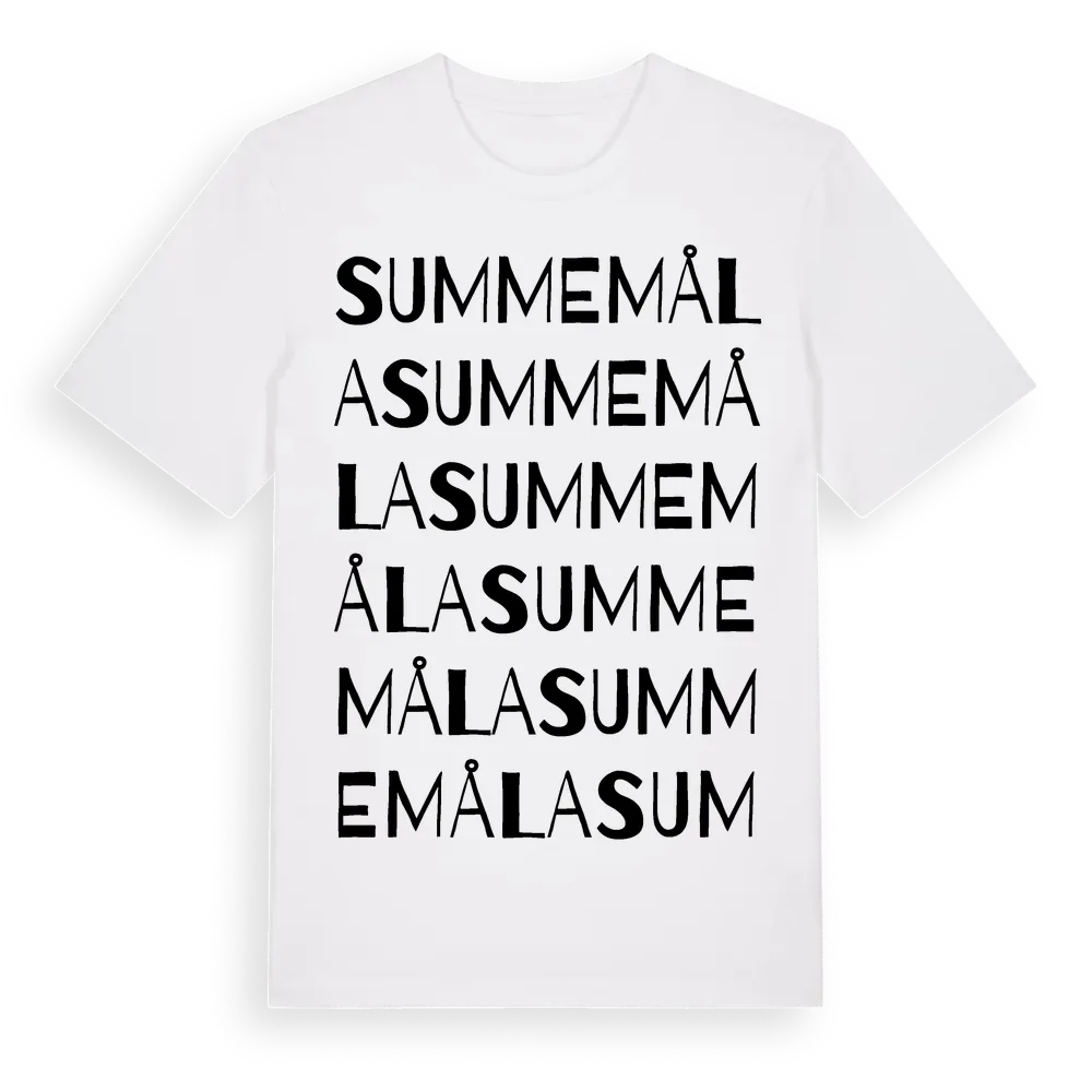 Summemåla ordlek t-shirt är inspirerad av Summemåla i Kronobergs län, Sverige. Tröjan är designad för dig som har en speciell koppling till platsen – oavsett om du bor här, har rötterna här eller bara älskar Summemåla.