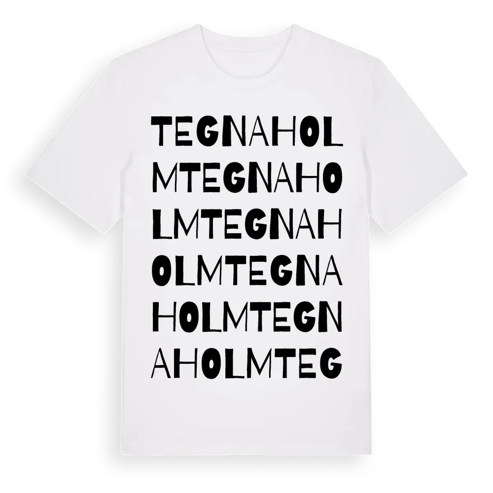 Tegnaholm ordlek t-shirt är inspirerad av Tegnaholm i Kronobergs län, Sverige. Tröjan är designad för dig som har en speciell koppling till platsen – oavsett om du bor här, har rötterna här eller bara älskar Tegnaholm.