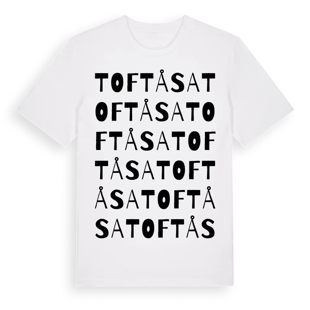 Toftåsa ordlek t-shirt är inspirerad av byn Toftåsa i Kronobergs län, Sverige. Tröjan är designad för dig som har en speciell koppling till platsen – oavsett om du bor här, har rötterna här eller bara älskar Toftåsa.