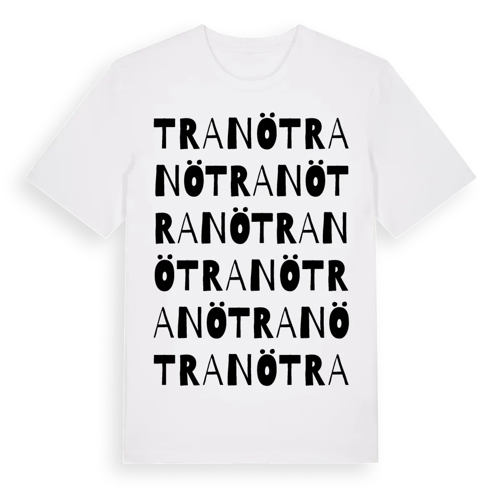 En ordlek byggd på Tranös namn. Subtilt och klurig – ett motiv som bara de som verkligen känner platsen fullt ut förstår. Premium bomull, unisex – från Tranö i Kronobergs län.