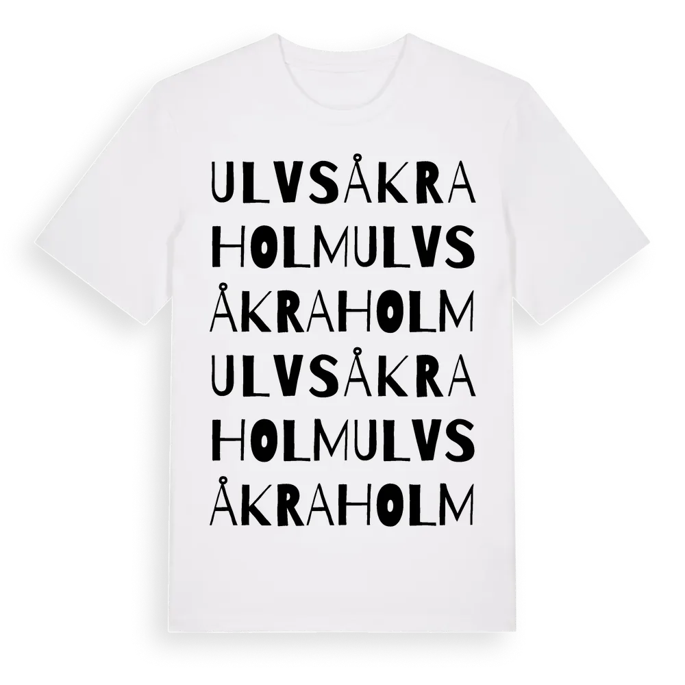 Ulvsåkraholm ordlek t-shirt är inspirerad av Ulvsåkraholm i Kronobergs län, Sverige. Tröjan är designad för dig som har en speciell koppling till platsen – oavsett om du bor här, har rötterna här eller bara älskar Ulvsåkraholm.