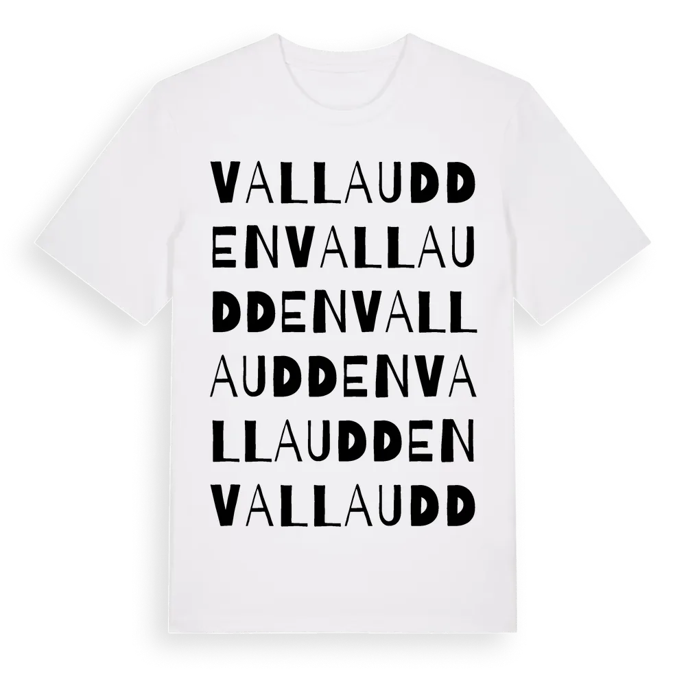 Vallaudden ordlek t-shirt är inspirerad av Vallaudden i Kronobergs län, Sverige. Tröjan är designad för dig som har en speciell koppling till platsen – oavsett om du bor här, har rötterna här eller bara älskar Vallaudden.
