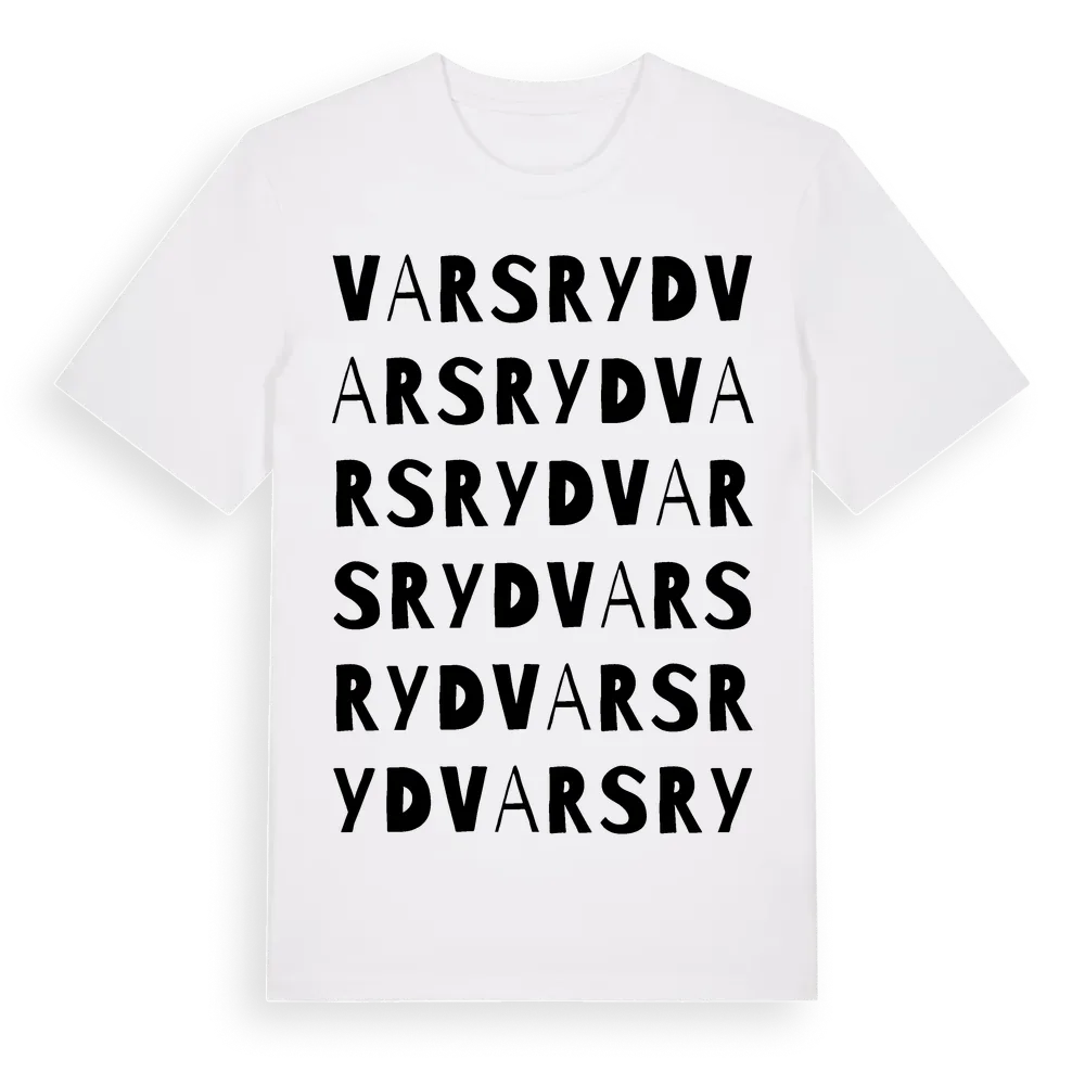Varsryd ordlek t-shirt är inspirerad av Varsryd i Kronobergs län, Sverige. Tröjan är designad för dig som har en speciell koppling till platsen – oavsett om du bor här, har rötterna här eller bara älskar Varsryd.