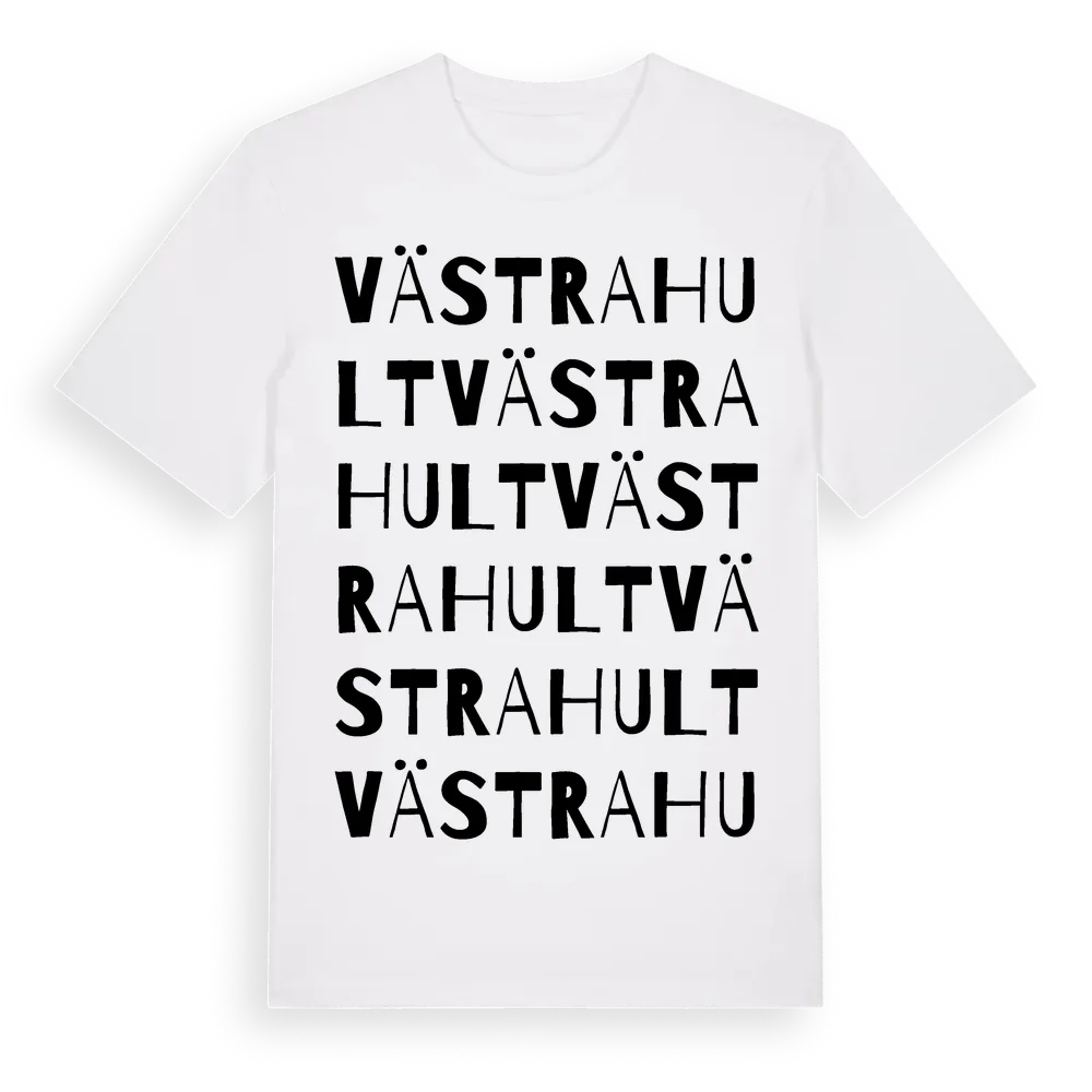 Västrahult ordlek t-shirt är inspirerad av Västrahult i Kronobergs län, Sverige. Tröjan är designad för dig som har en speciell koppling till platsen – oavsett om du bor här, har rötterna här eller bara älskar Västrahult.