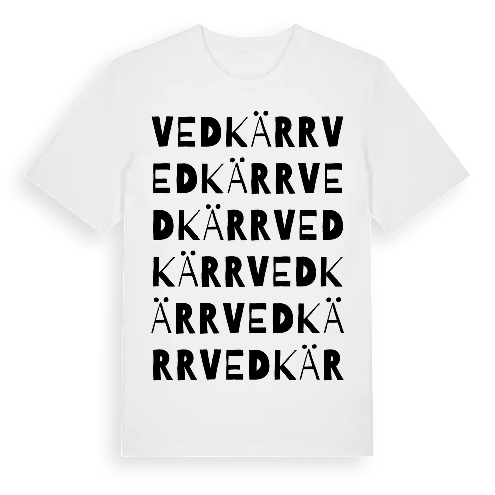 Vedkärr ordlek t-shirt är inspirerad av byn Vedkärr i Kronobergs län, Sverige. Tröjan är designad för dig som har en speciell koppling till platsen – oavsett om du bor här, har rötterna här eller bara älskar Vedkärr.