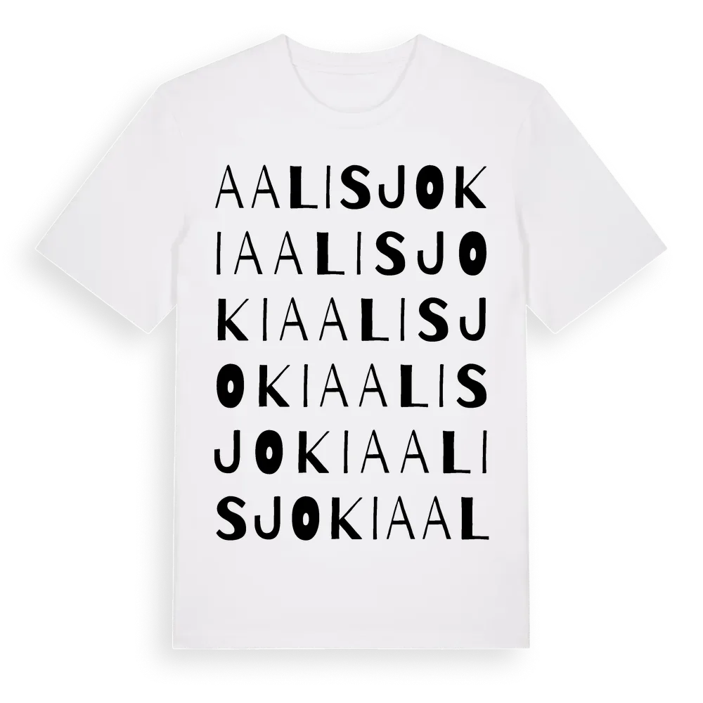 Aalisjoki ordlek t-shirt är inspirerad av byn Aalisjoki i Norrbottens län, Sverige. Tröjan är designad för dig som har en speciell koppling till platsen – oavsett om du bor här, har rötterna här eller bara älskar Aalisjoki.
