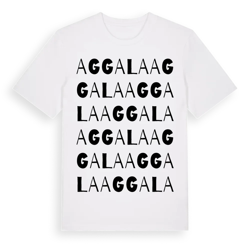 Aggala ordlek t-shirt är inspirerad av byn Aggala i Norrbottens län, Sverige. Tröjan är designad för dig som har en speciell koppling till platsen – oavsett om du bor här, har rötterna här eller bara älskar Aggala.