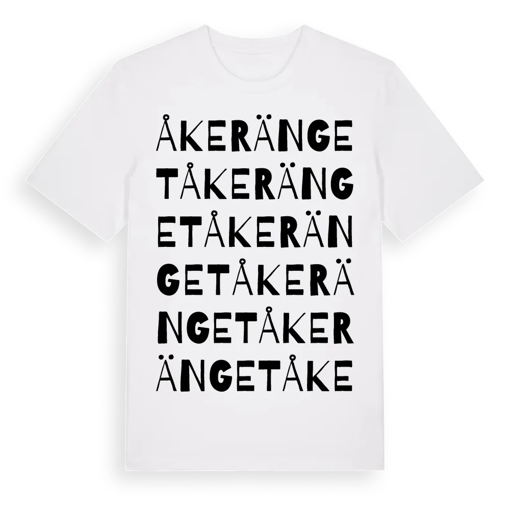 Åkeränget ordlek t-shirt är inspirerad av byn Åkeränget i Norrbottens län, Sverige. Tröjan är designad för dig som har en speciell koppling till platsen – oavsett om du bor här, har rötterna här eller bara älskar Åkeränget.