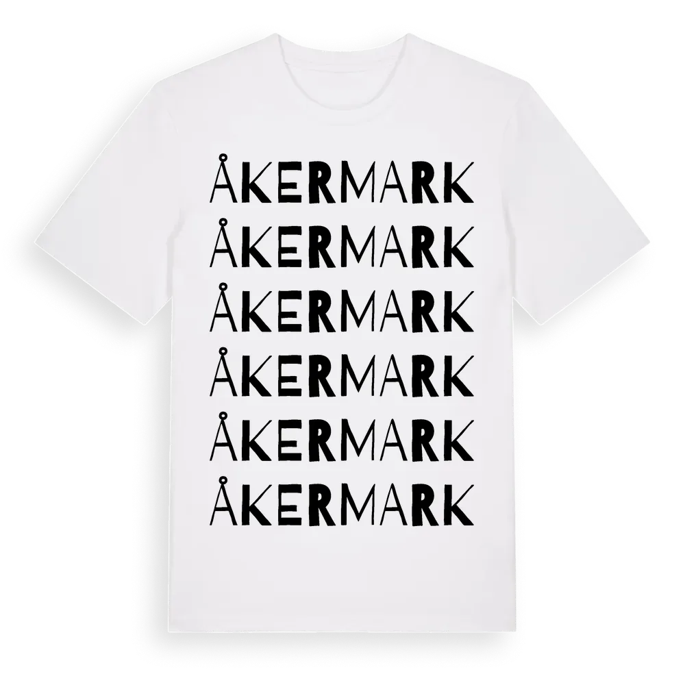 Åkermark ordlek t-shirt är inspirerad av byn Åkermark i Norrbottens län, Sverige. Tröjan är designad för dig som har en speciell koppling till platsen – oavsett om du bor här, har rötterna här eller bara älskar Åkermark.