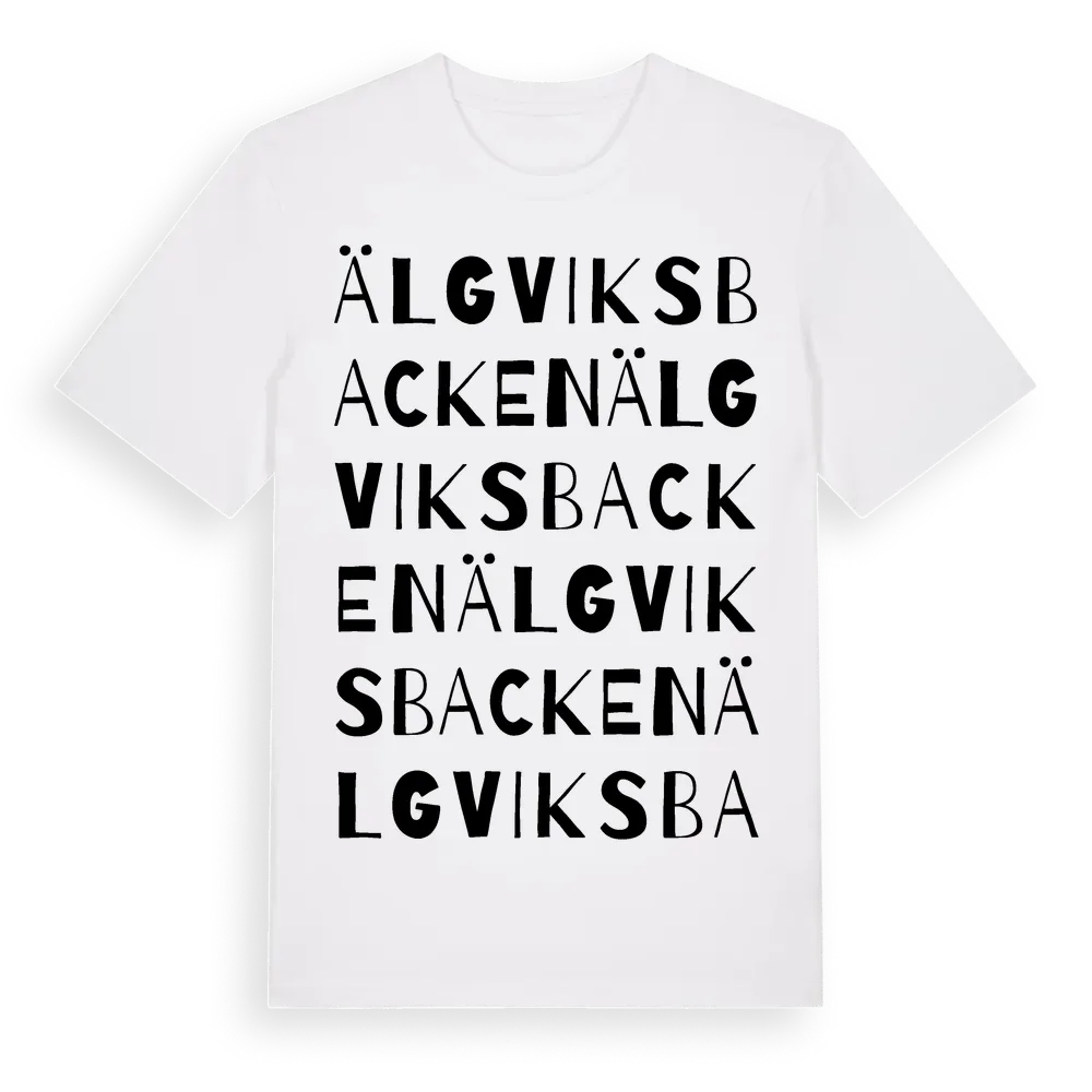 Älgviksbacken ordlek t-shirt är inspirerad av byn Älgviksbacken i Norrbottens län, Sverige. Tröjan är designad för dig som har en speciell koppling till platsen – oavsett om du bor här, har rötterna här eller bara älskar Älgviksbacken.