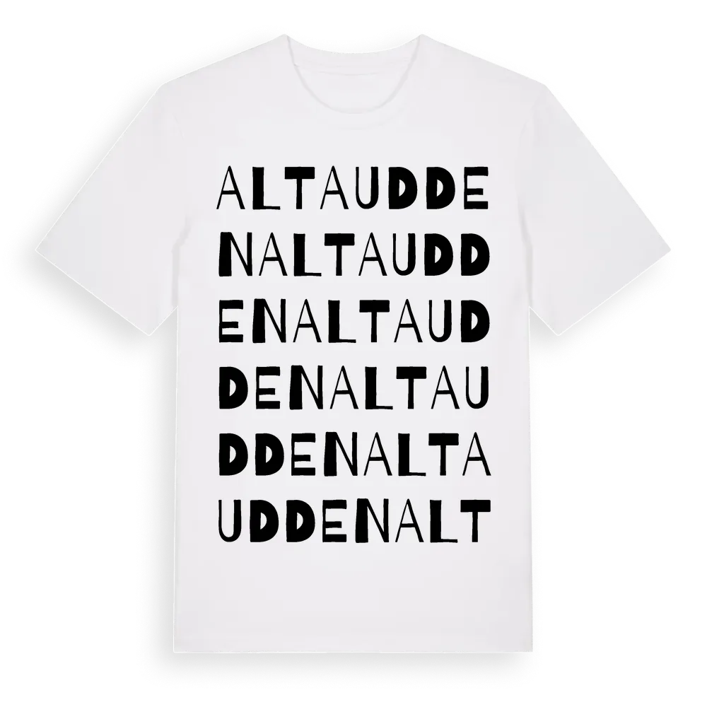Altaudden ordlek t-shirt är inspirerad av Altaudden i Norrbottens län, Sverige. Tröjan är designad för dig som har en speciell koppling till platsen – oavsett om du bor här, har rötterna här eller bara älskar Altaudden.