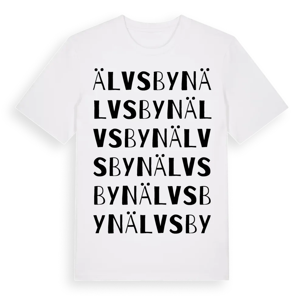 Älvsbyn ordlek t-shirt är inspirerad av staden Älvsbyn i Norrbottens län, Sverige. Tröjan är designad för dig som har en speciell koppling till platsen – oavsett om du bor här, har rötterna här eller bara älskar Älvsbyn.