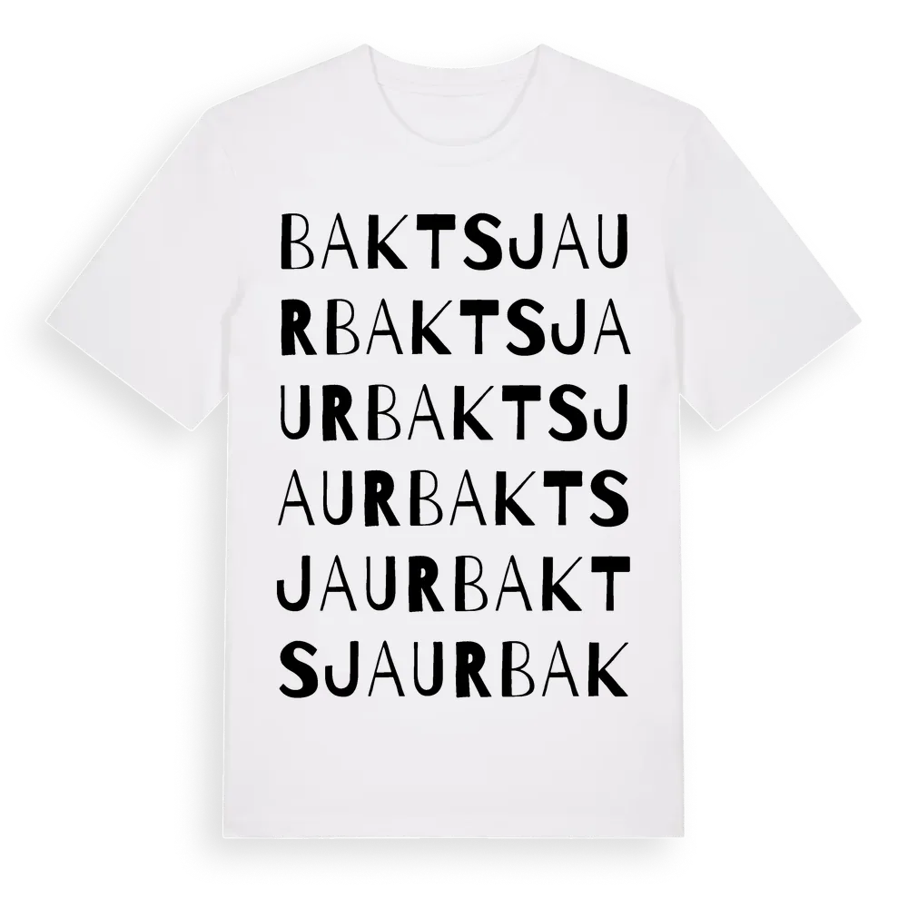 Baktsjaur ordlek t-shirt är inspirerad av byn Baktsjaur i Norrbottens län, Sverige. Tröjan är designad för dig som har en speciell koppling till platsen – oavsett om du bor här, har rötterna här eller bara älskar Baktsjaur.