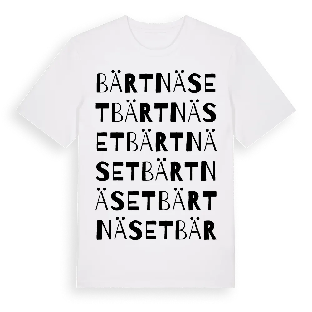 Bärtnäset ordlek t-shirt är inspirerad av byn Bärtnäset i Norrbottens län, Sverige. Tröjan är designad för dig som har en speciell koppling till platsen – oavsett om du bor här, har rötterna här eller bara älskar Bärtnäset.