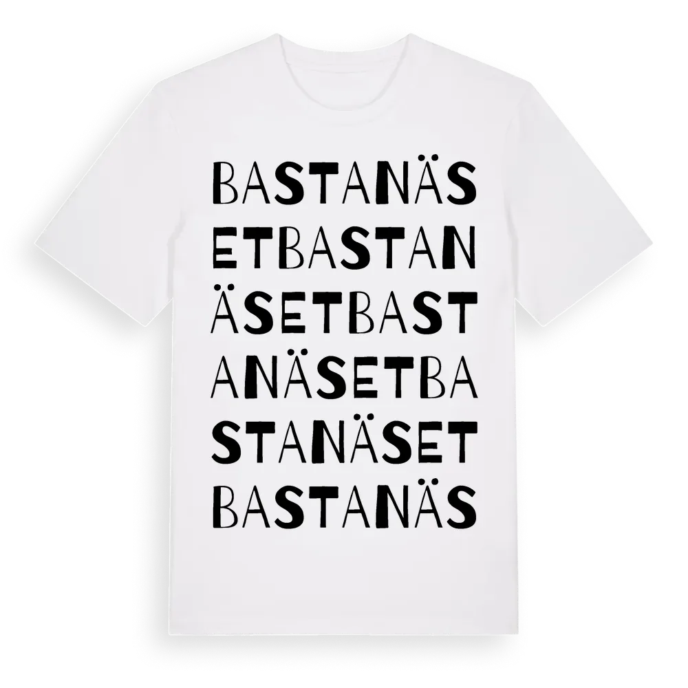Bastanäset ordlek t-shirt är inspirerad av byn Bastanäset i Norrbottens län, Sverige. Tröjan är designad för dig som har en speciell koppling till platsen – oavsett om du bor här, har rötterna här eller bara älskar Bastanäset.