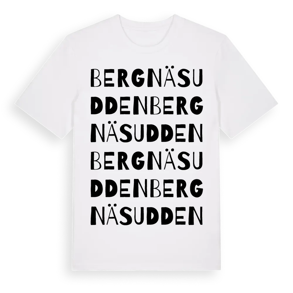 Bergnäsudden ordlek t-shirt är inspirerad av Bergnäsudden i Norrbottens län, Sverige. Tröjan är designad för dig som har en speciell koppling till platsen – oavsett om du bor här, har rötterna här eller bara älskar Bergnäsudden.