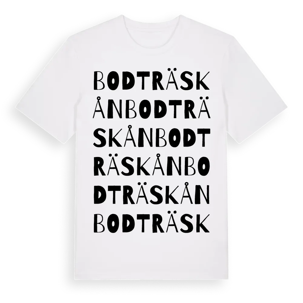 Bodträskån ordlek t-shirt är inspirerad av byn Bodträskån i Norrbottens län, Sverige. Tröjan är designad för dig som har en speciell koppling till platsen – oavsett om du bor här, har rötterna här eller bara älskar Bodträskån.