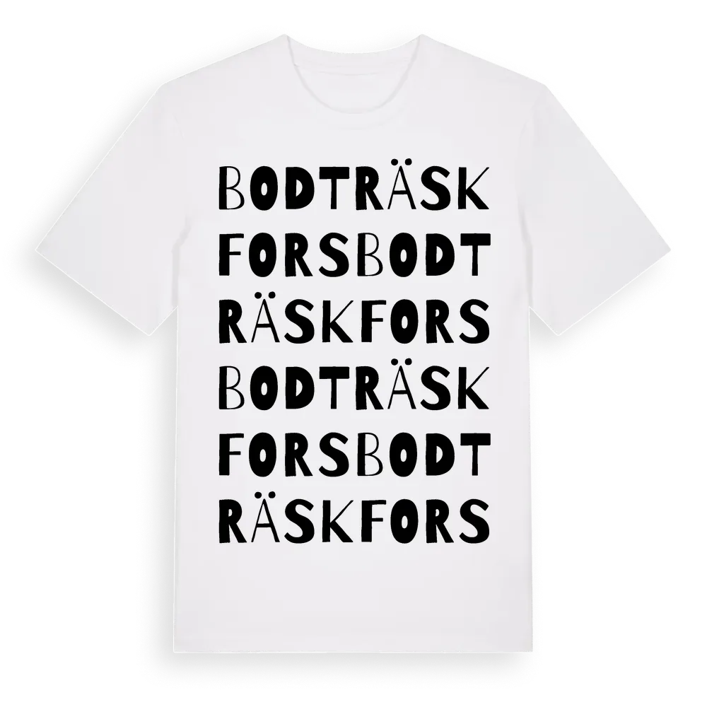 Bodträskfors ordlek t-shirt är inspirerad av byn Bodträskfors i Norrbottens län, Sverige. Tröjan är designad för dig som har en speciell koppling till platsen – oavsett om du bor här, har rötterna här eller bara älskar Bodträskfors.