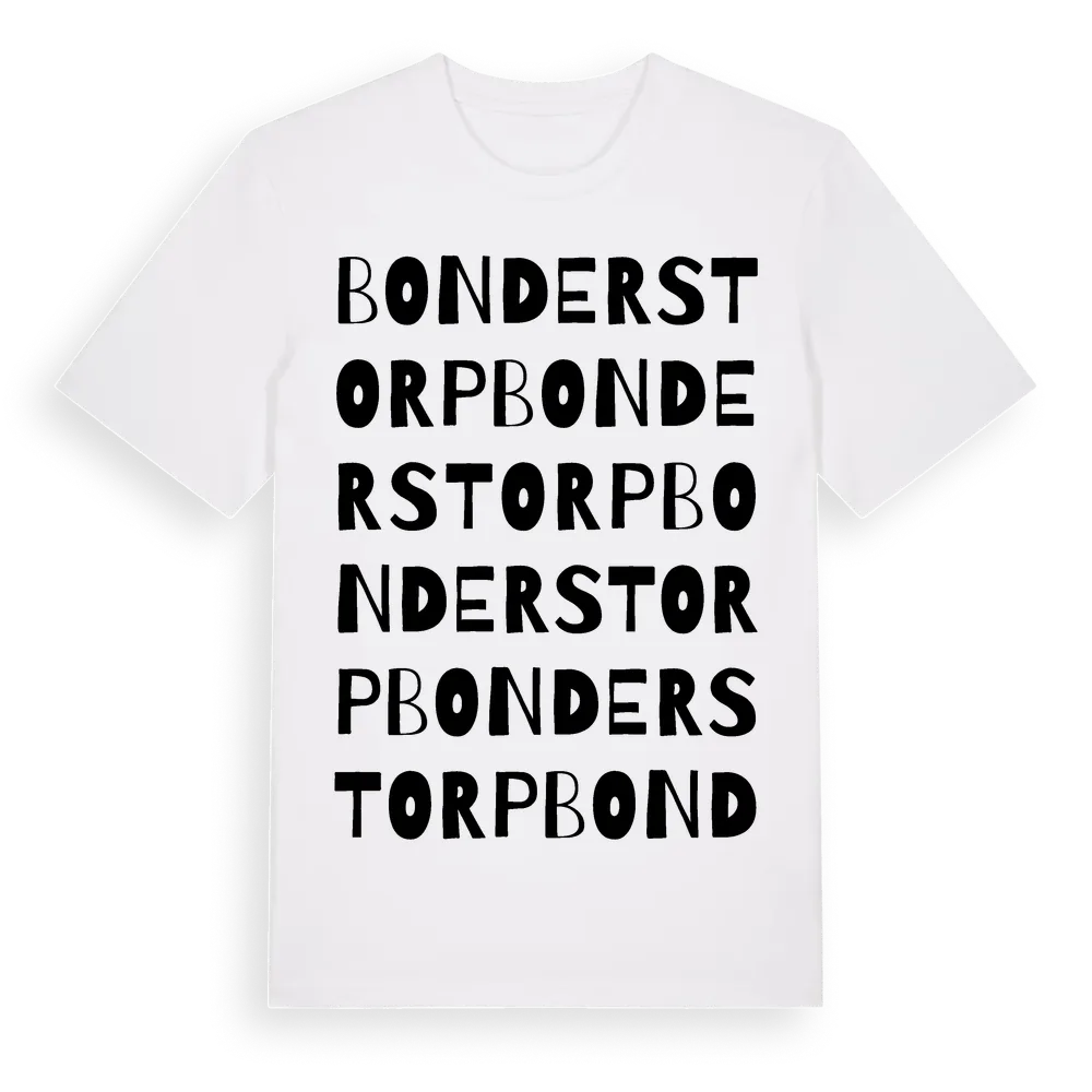 Bonderstorp ordlek t-shirt är inspirerad av Bonderstorp i Norrbottens län, Sverige. Tröjan är designad för dig som har en speciell koppling till platsen – oavsett om du bor här, har rötterna här eller bara älskar Bonderstorp.