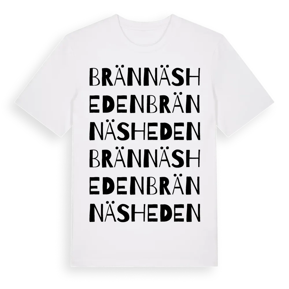 Brännäsheden ordlek t-shirt är inspirerad av Brännäsheden i Norrbottens län, Sverige. Tröjan är designad för dig som har en speciell koppling till platsen – oavsett om du bor här, har rötterna här eller bara älskar Brännäsheden.