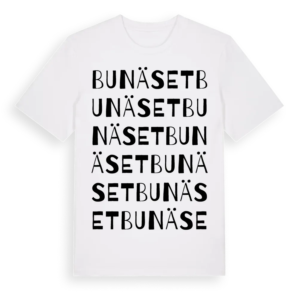 Bunäset ordlek t-shirt är inspirerad av Bunäset i Norrbottens län, Sverige. Tröjan är designad för dig som har en speciell koppling till platsen – oavsett om du bor här, har rötterna här eller bara älskar Bunäset.