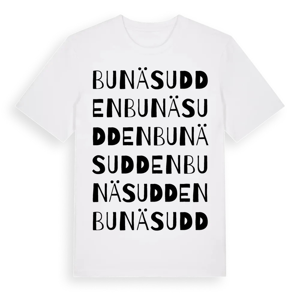 Bunäsudden ordlek t-shirt är inspirerad av byn Bunäsudden i Norrbottens län, Sverige. Tröjan är designad för dig som har en speciell koppling till platsen – oavsett om du bor här, har rötterna här eller bara älskar Bunäsudden.