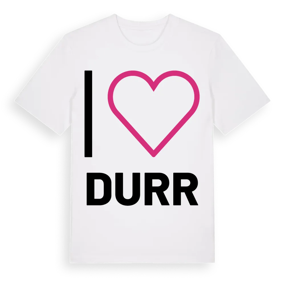 Det klassiska "I ❤ Durr"-motivet i stort format som täcker hela bröstet. För dig som vill visa kärleken till Durr på riktigt. Premium bomull, unisex – från byn Durr i Norrbottens län.