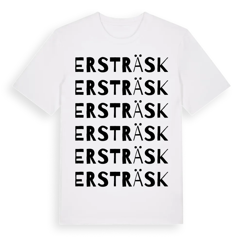 En ordlek byggd på Ersträsks namn. Subtilt och klurig – ett motiv som bara de som verkligen känner platsen fullt ut förstår. Premium bomull, unisex – från Ersträsk i Norrbottens län.