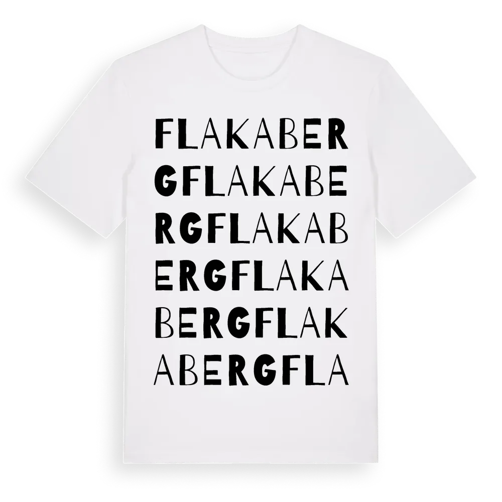 Flakaberg ordlek t-shirt är inspirerad av byn Flakaberg i Norrbottens län, Sverige. Tröjan är designad för dig som har en speciell koppling till platsen – oavsett om du bor här, har rötterna här eller bara älskar Flakaberg.