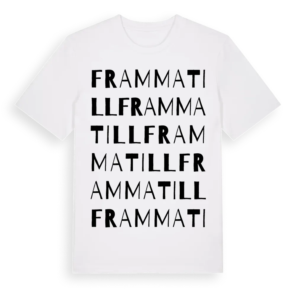 Frammatill ordlek t-shirt är inspirerad av Frammatill i Norrbottens län, Sverige. Tröjan är designad för dig som har en speciell koppling till platsen – oavsett om du bor här, har rötterna här eller bara älskar Frammatill.