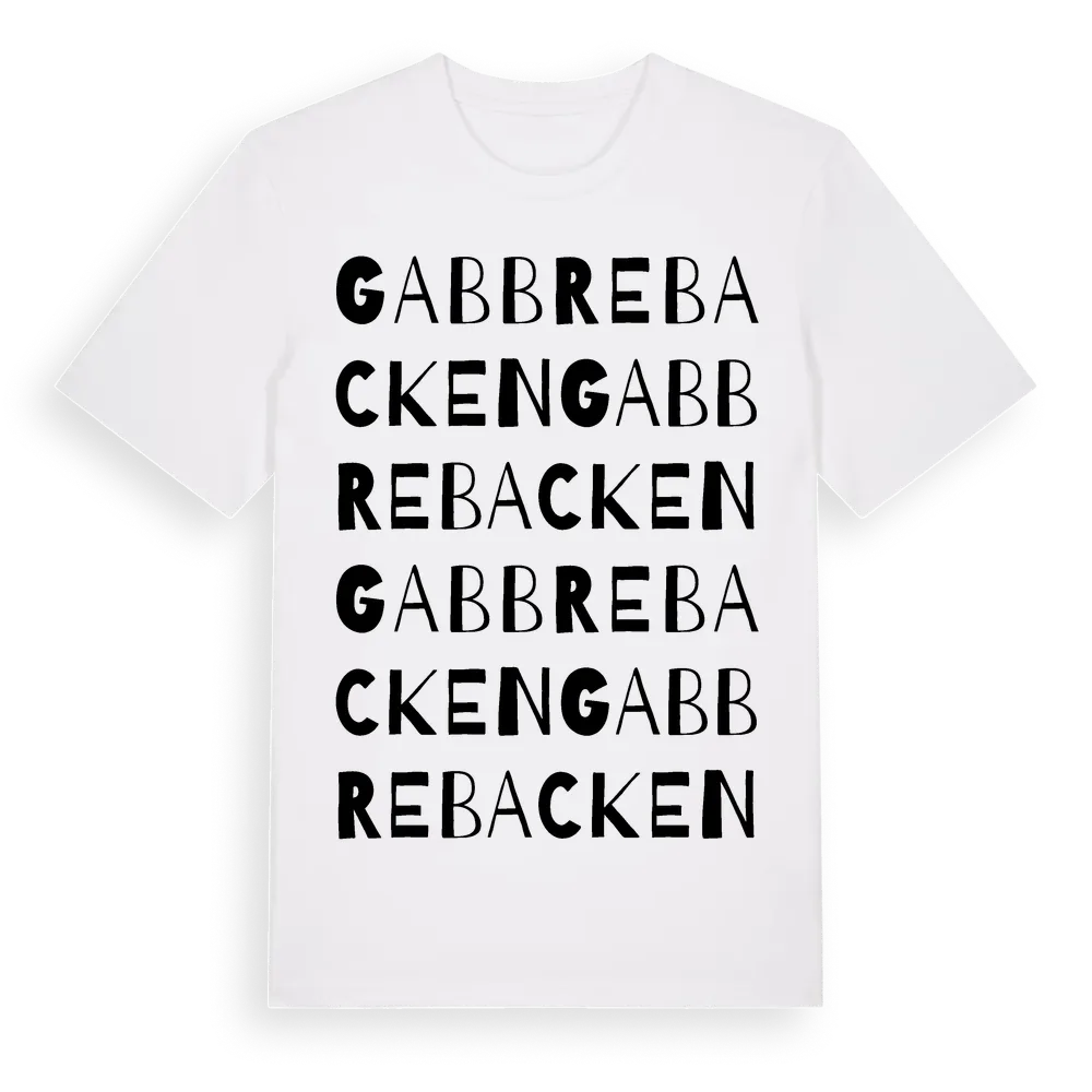 Gabbrebacken ordlek t-shirt är inspirerad av byn Gabbrebacken i Norrbottens län, Sverige. Tröjan är designad för dig som har en speciell koppling till platsen – oavsett om du bor här, har rötterna här eller bara älskar Gabbrebacken.