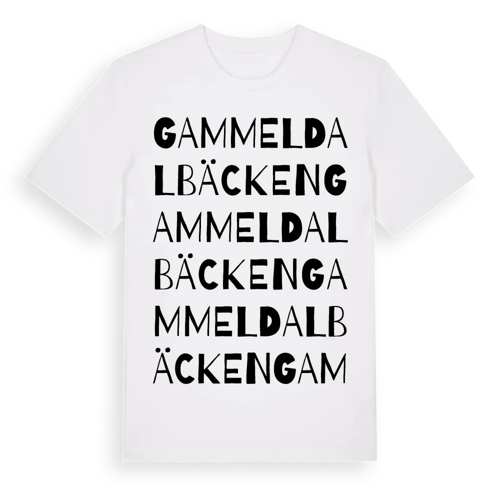 Gammeldalbäcken ordlek t-shirt är inspirerad av Gammeldalbäcken i Norrbottens län, Sverige. Tröjan är designad för dig som har en speciell koppling till platsen – oavsett om du bor här, har rötterna här eller bara älskar Gammeldalbäcken.
