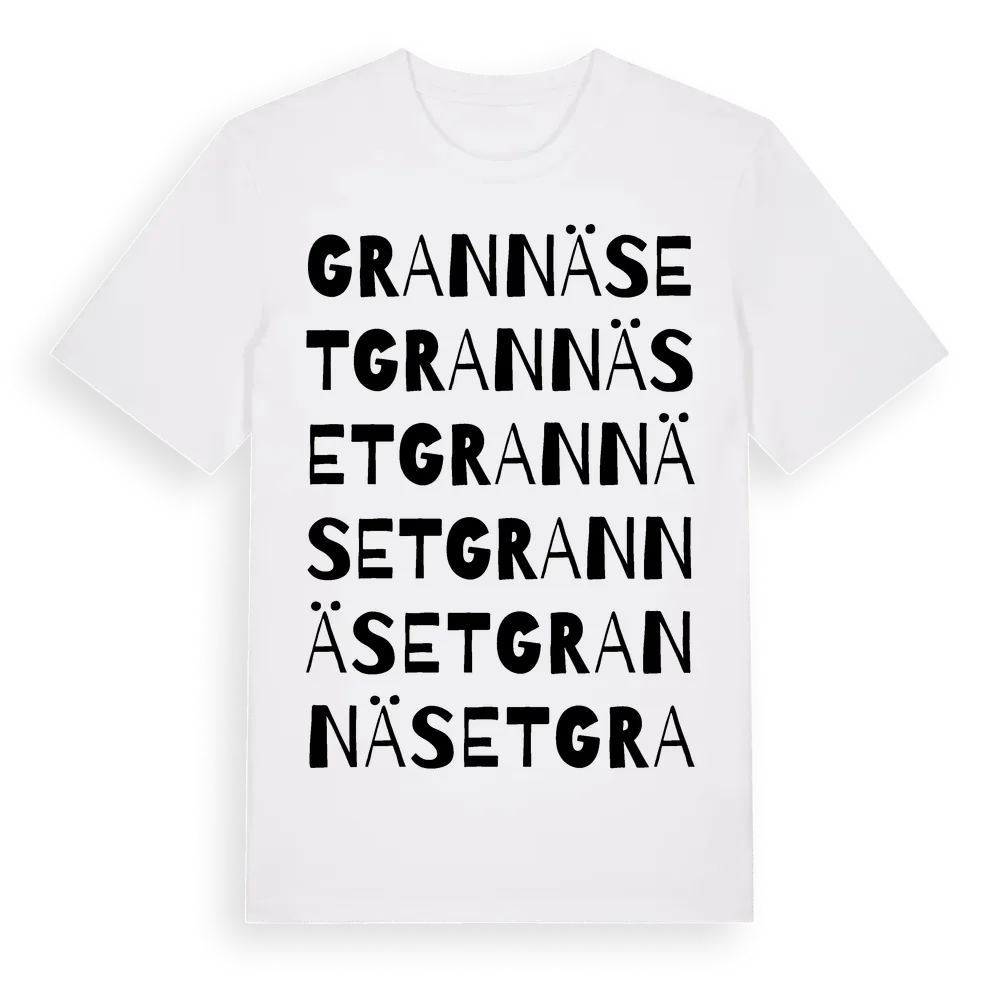 Grannäset ordlek t-shirt är inspirerad av byn Grannäset i Norrbottens län, Sverige. Tröjan är designad för dig som har en speciell koppling till platsen – oavsett om du bor här, har rötterna här eller bara älskar Grannäset.