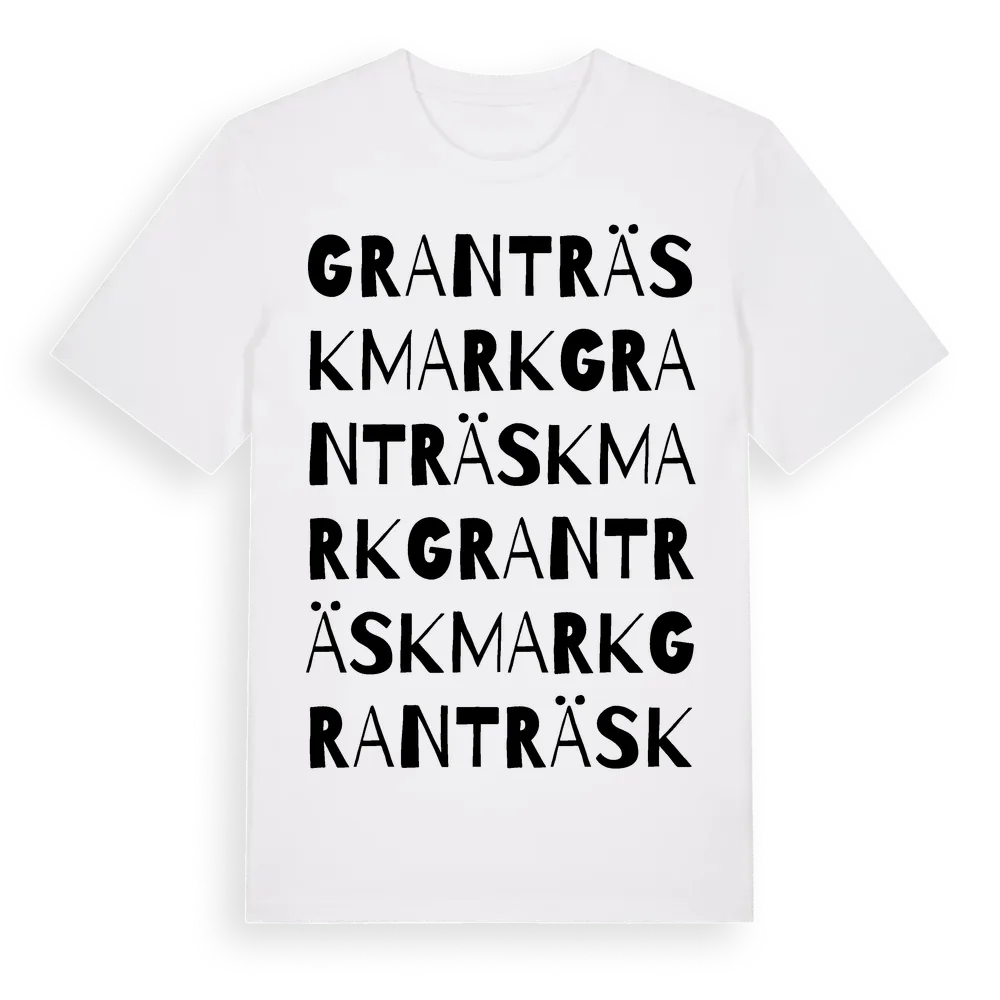 Granträskmark ordlek t-shirt är inspirerad av Granträskmark i Norrbottens län, Sverige. Tröjan är designad för dig som har en speciell koppling till platsen – oavsett om du bor här, har rötterna här eller bara älskar Granträskmark.
