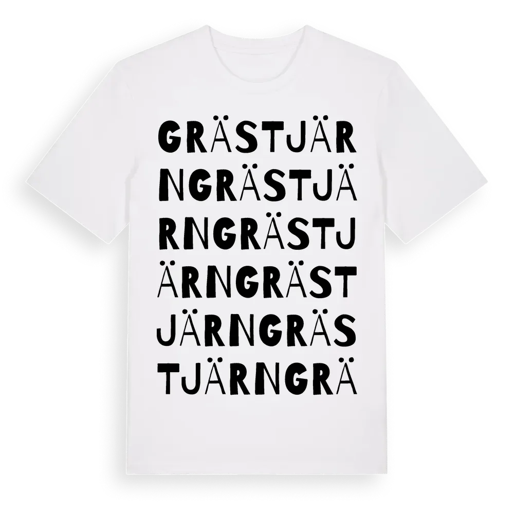 Grästjärn ordlek t-shirt är inspirerad av Grästjärn i Norrbottens län, Sverige. Tröjan är designad för dig som har en speciell koppling till platsen – oavsett om du bor här, har rötterna här eller bara älskar Grästjärn.