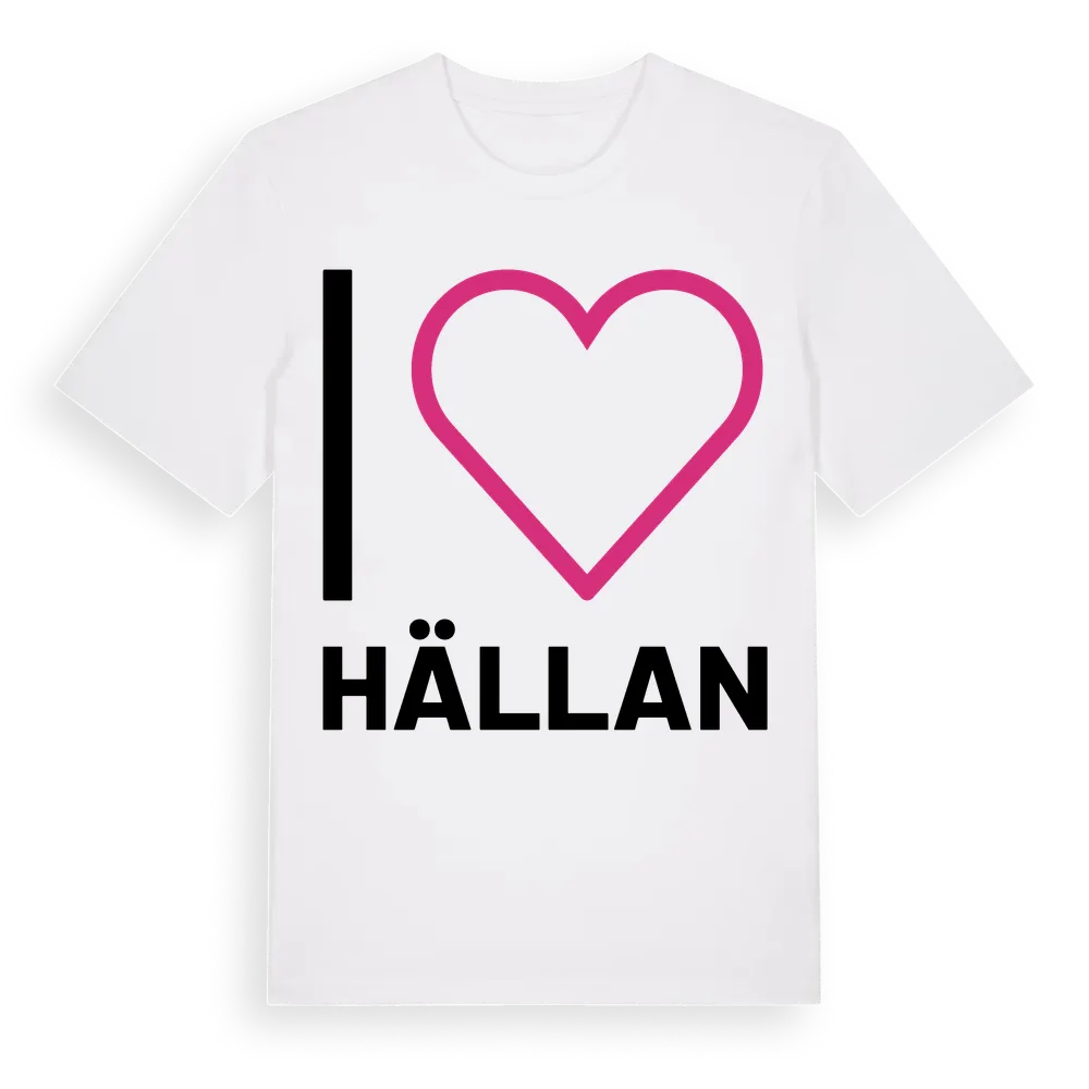Jag älskar Hällan t-shirt stort tryck är inspirerad av byn Hällan i Norrbottens län, Sverige. Tröjan är designad för dig som har en speciell koppling till platsen – oavsett om du bor här, har rötterna här eller bara älskar Hällan.