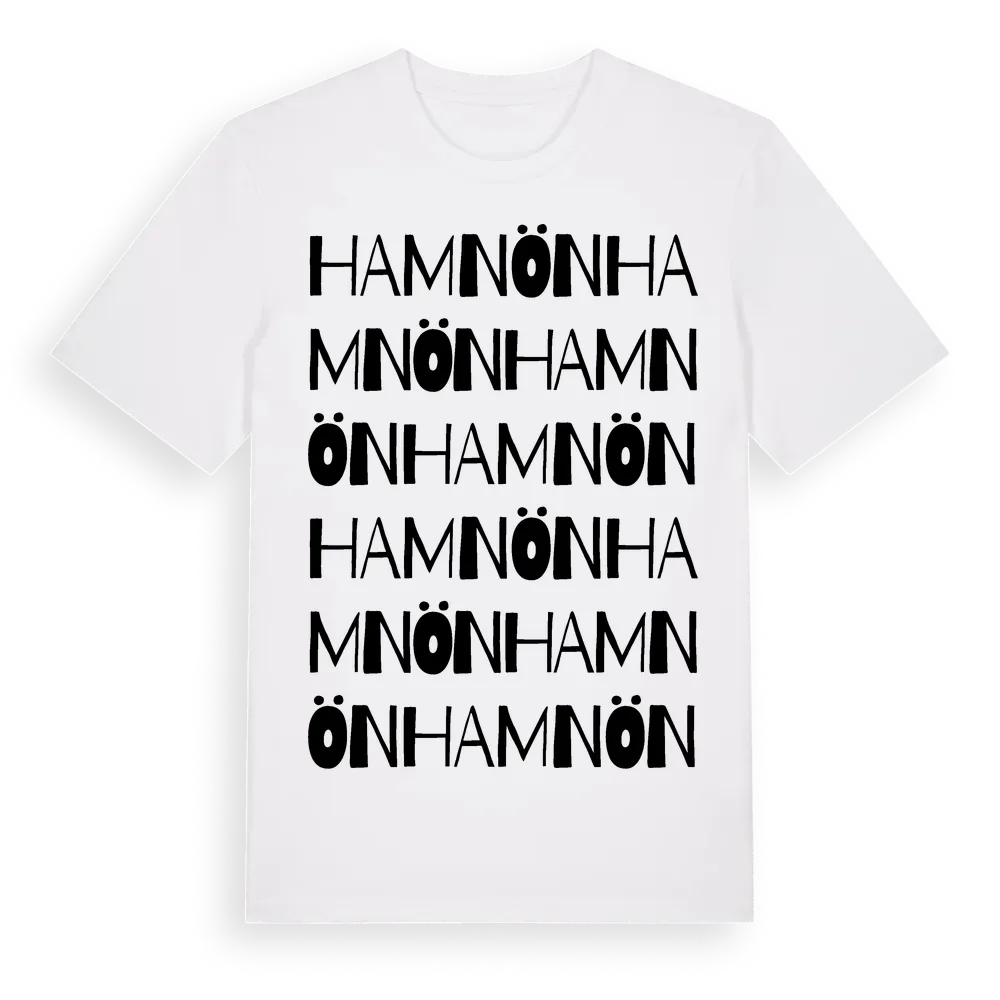 En ordlek byggd på Hamnöns namn. Subtilt och klurig – ett motiv som bara de som verkligen känner platsen fullt ut förstår. Premium bomull, unisex – från ön Hamnön i Norrbottens län.