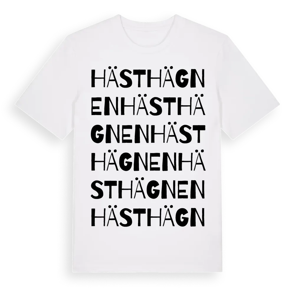 Hästhägnen ordlek t-shirt är inspirerad av Hästhägnen i Norrbottens län, Sverige. Tröjan är designad för dig som har en speciell koppling till platsen – oavsett om du bor här, har rötterna här eller bara älskar Hästhägnen.