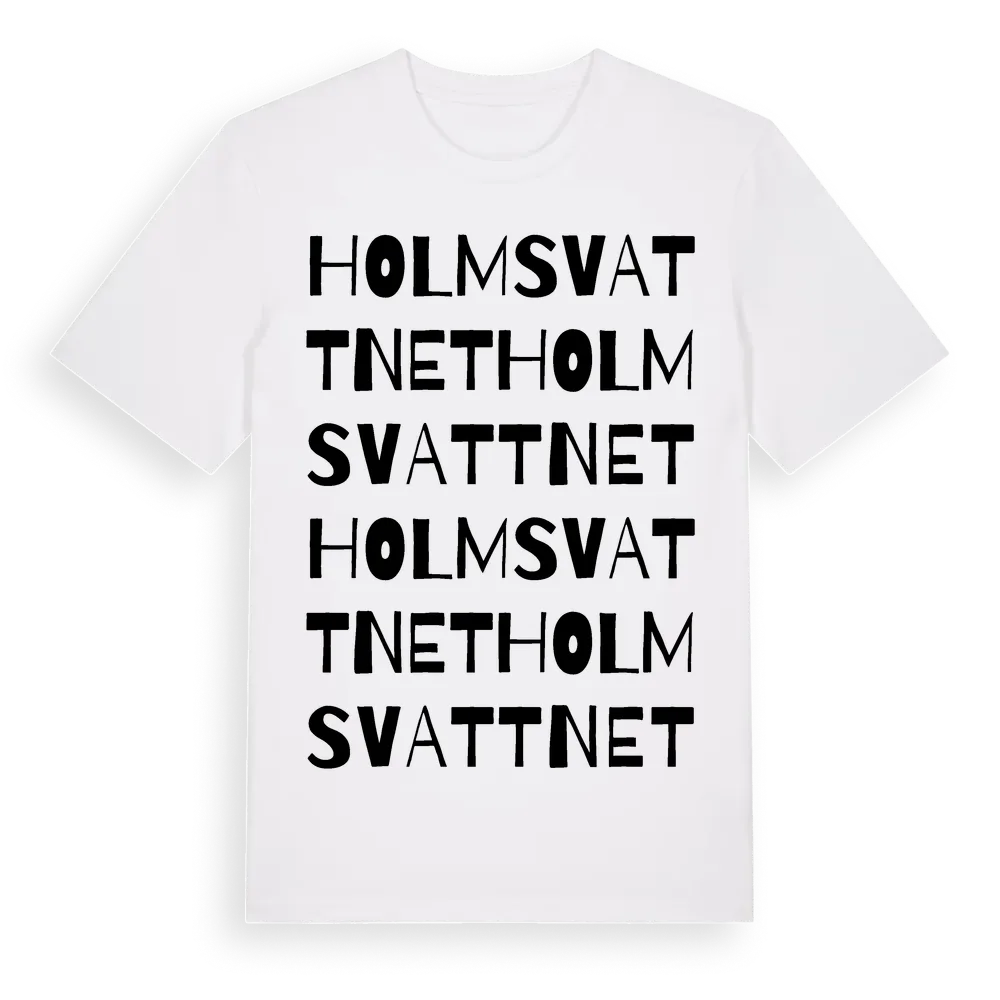 Holmsvattnet ordlek t-shirt är inspirerad av byn Holmsvattnet i Norrbottens län, Sverige. Tröjan är designad för dig som har en speciell koppling till platsen – oavsett om du bor här, har rötterna här eller bara älskar Holmsvattnet.