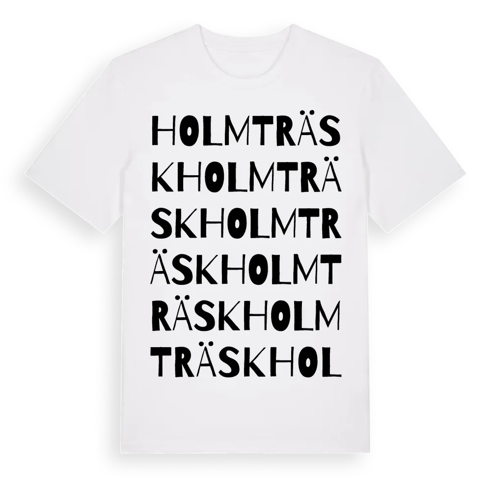Holmträsk ordlek t-shirt är inspirerad av Holmträsk i Norrbottens län, Sverige. Tröjan är designad för dig som har en speciell koppling till platsen – oavsett om du bor här, har rötterna här eller bara älskar Holmträsk.