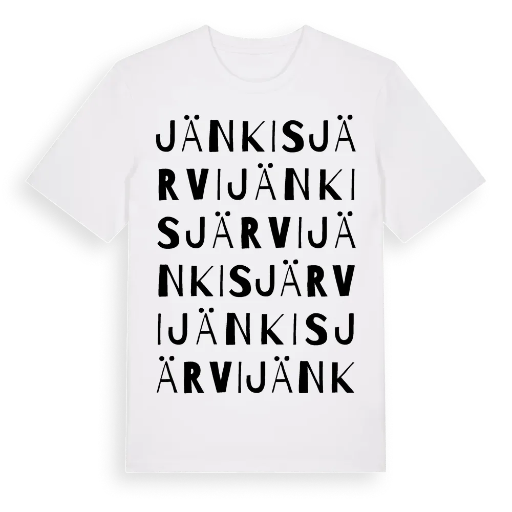 Jänkisjärvi ordlek t-shirt är inspirerad av byn Jänkisjärvi i Norrbottens län, Sverige. Tröjan är designad för dig som har en speciell koppling till platsen – oavsett om du bor här, har rötterna här eller bara älskar Jänkisjärvi.