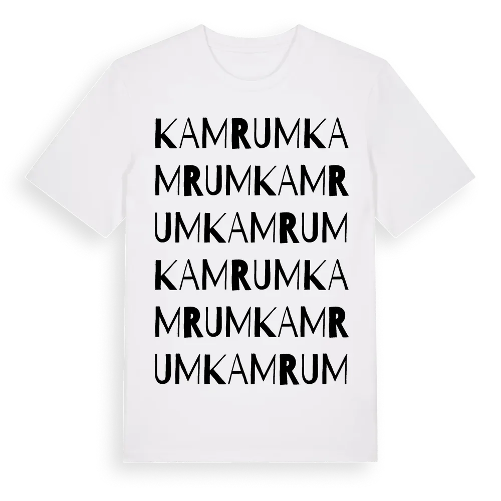 Kamrum ordlek t-shirt är inspirerad av byn Kamrum i Norrbottens län, Sverige. Tröjan är designad för dig som har en speciell koppling till platsen – oavsett om du bor här, har rötterna här eller bara älskar Kamrum.